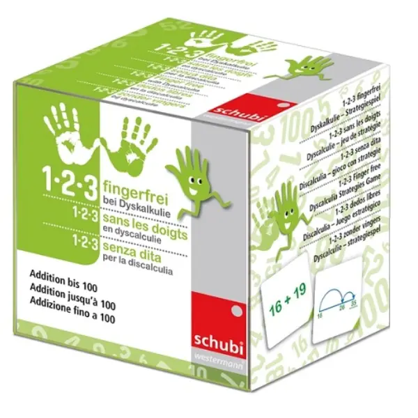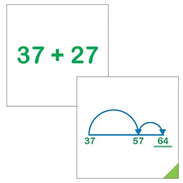 Contém 40 pares de cartões para a operação lógico-matemática da adição no universo numérico até 100. Um par de cartões é composto por um cartão com um exercício e outro com a solução correspondente. Os exercícios devem ser sempre efetuados com a ajuda da estratégia de cálculo: as dezenas antes das unidades. Para ajudar as crianças a adquirirem esta estratégia, será visualizada nos cartões das soluções ou numa sequência numérica, para além da solução, o método de cálculo será representado graficamente com o número de partida do exercício e o resultado intermédio.