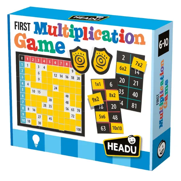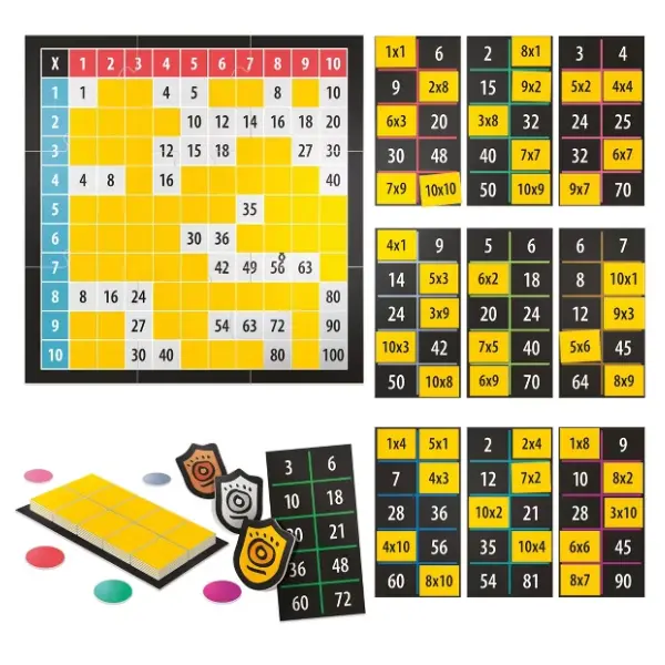 Conteúdo: 10 placas de bingo, 100 cartões das multiplicações, 100 marcadores, 1 tabuleiro das multiplicações (em puzzle), 10 fichas salva-erros, 3 insígnias, 1 manual de instruções.