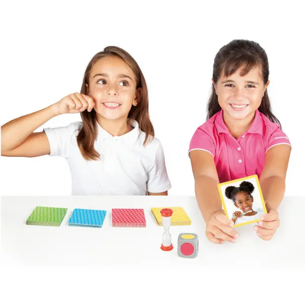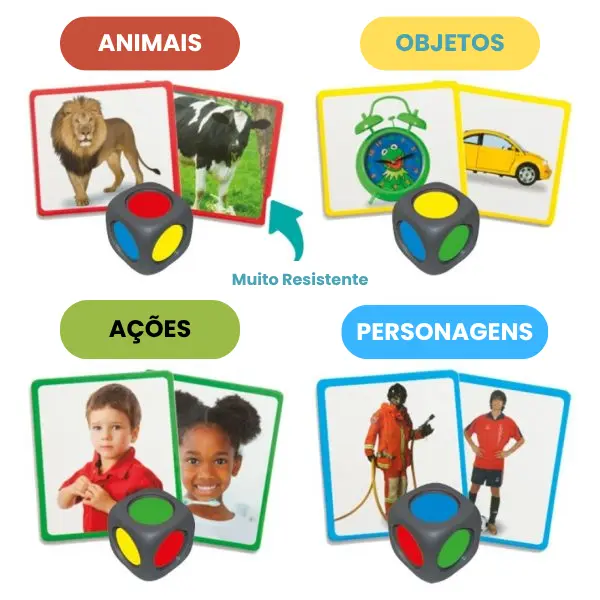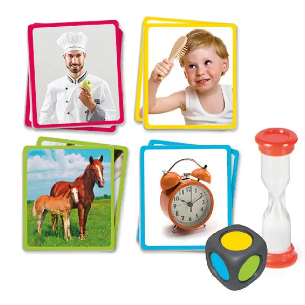 Conteúdo: 40 fichas com imagens, 1 dado gigante (com 3,5 cm de face), 1 ampulheta e uma mala.