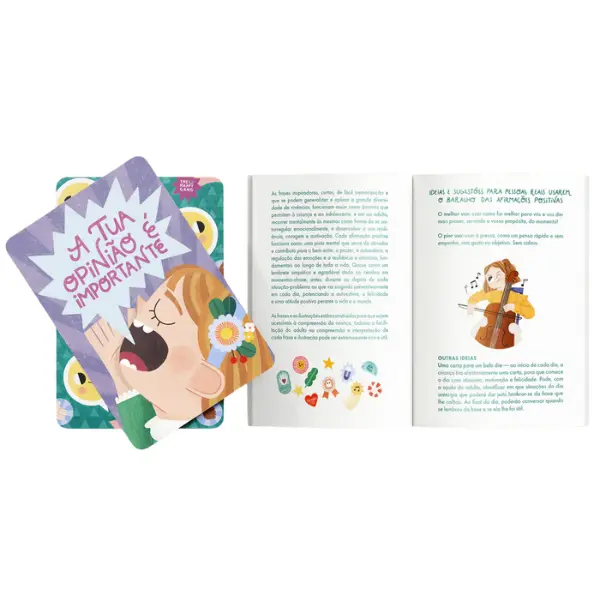 Idade: +8 anos | Conteúdo: 30 cartas ilustradas com afirmações positivas que te vão ajudar a construir um eu mais confiante e um livro que te sugere maneiras de as explorares em família | Dimensões: 17,5 x 12,5 cm.