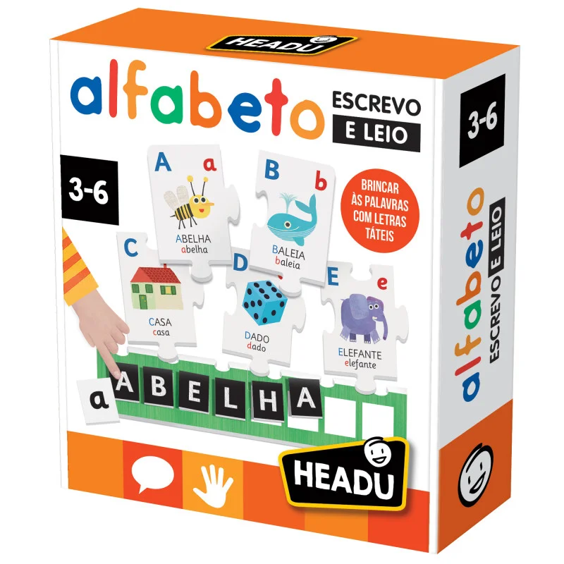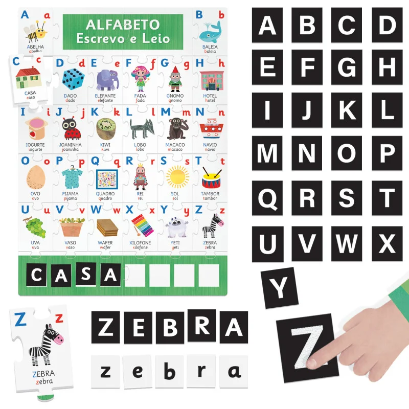 Com “Alfabeto – Escrevo e Leio” as crianças constroem o puzzle do grande alfabeto e aprendem letras e palavras. Além disso, com as letras soltas e táteis, formam palavras no puzzle, tanto em maiúsculas como em minúsculas, aprendendo a escrever.