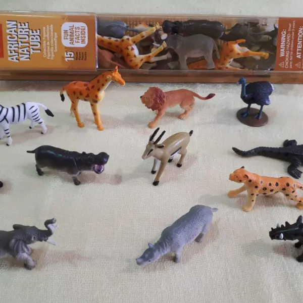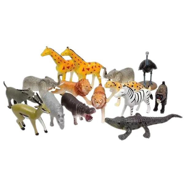 Contém 15 Animais Selvagens: girafa, hipopótamo, elefante, crocodilo, leão, zebra, chita, rinoceronte, javali, mandril, gazela e casuar. Alguns estão duplicados.