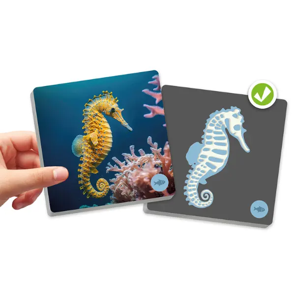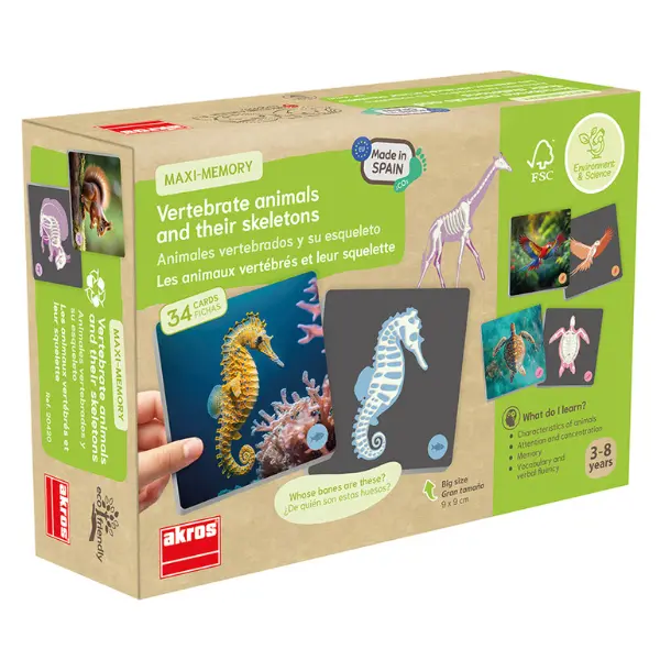 Descubra os animais vertebrados e seus esqueletos através de um jogo de memória, com grandes cartões contendo imagens reais.