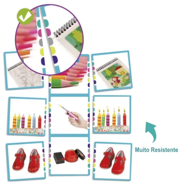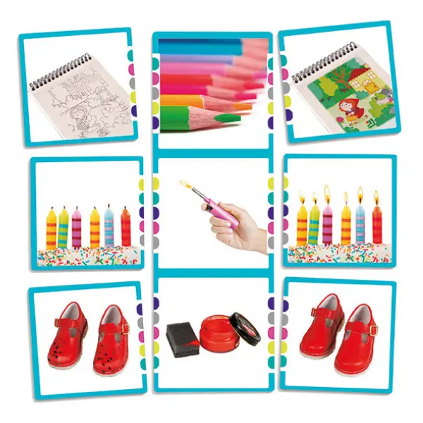 Conteúdo: 90 fotografias (cartão – 7,5 cm x 7,5 cm), distribuídas em 30 séries de “antes-durante-depois”; Peças com sistema auto-corretivo; Instruções com propostas de utilização.