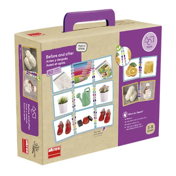 O ‘Antes e Depois’ inicia-se com 10 fichas-mestras centrais de séries de 3: antes-durante-depois. Pretende-se que a criança coloque em ambos os lados, as fichas correspondentes: antes-depois. Possui um sistema auto-corretor com uma faixa de cinco cores.