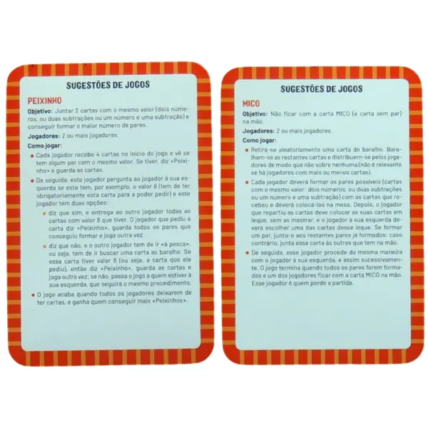 - Peixinho – juntar 2 cartas com o mesmo valor – dois números ou duas subtrações ou um número e uma subtração;
