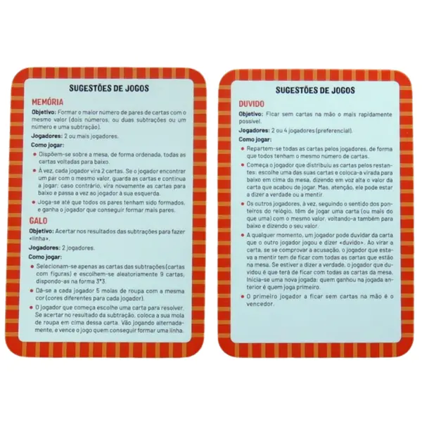- Memória – formar o maior número de pares de cartas com o mesmo valor – dois números ou duas subtrações ou um número e uma subtração;