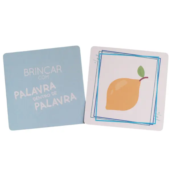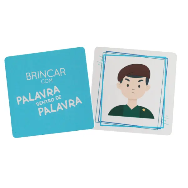 Idade: dos 4 aos 8 anos | Conteúdo: Total de cartas: 53 Cartas; 25 cartas em azul claro (palavras maiores); 25 cartas em azul escuro (palavras mais pequenas); 1 carta com o conteúdo e as regras do jogo; 1 carta com o objetivo geral e com os objetivos específicos do jogo; 1 carta com soluções do jogo.