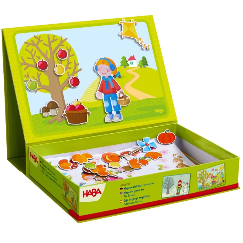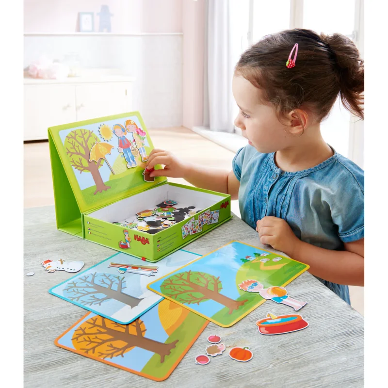 A caixa magnética Estações do Ano oferece 4 cenários e 90 peças magnéticas para compor as atividades mais divertidas para cada estação do ano.