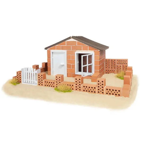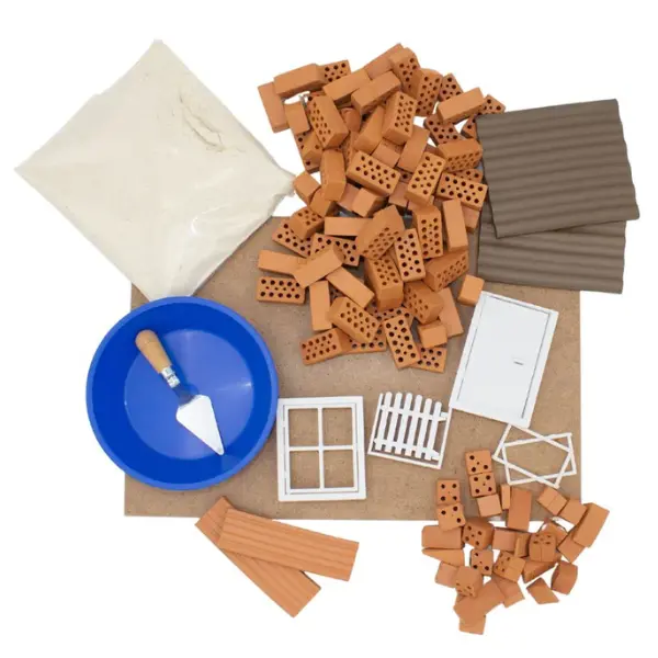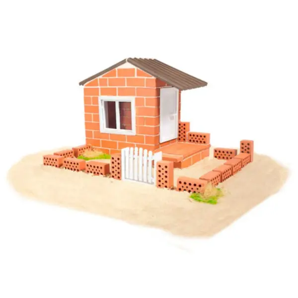 Mais de 130 peças, que permitem a construção de vários modelos de casas. Tijolos e “cimento” para recriar os modelos propostos, ou eventualmente outros. Mergulhando a construção em água, a argamassa dissolve-se, ficando os tijolos disponíveis para nova construção!