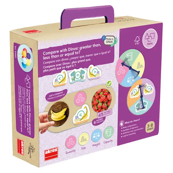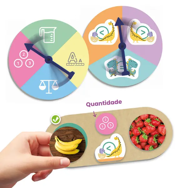 Conteúdo: 6 quadros de comparação reversíveis (18,5 x 7,5 cm); 24 cartões circulares de categoria (6 de cada categoria); 18 cartões de DINO (6 de cada DINO); 45 cartões circulares com imagens reais de um lado e ilustrações do outro (5 cm); 3 roletas regraváveis ​​(11,5 cm).