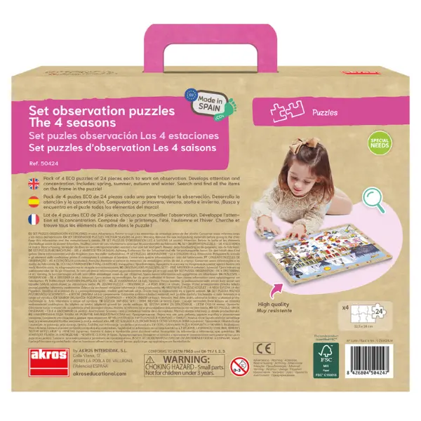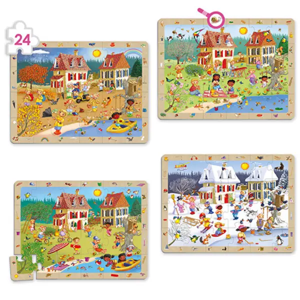 Um conjunto de 4 puzzles, com as 4 estações do ano, para desenvolver as competências de observação. Cada puzzle contém 24 peças.
