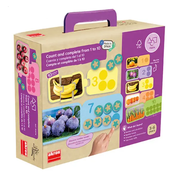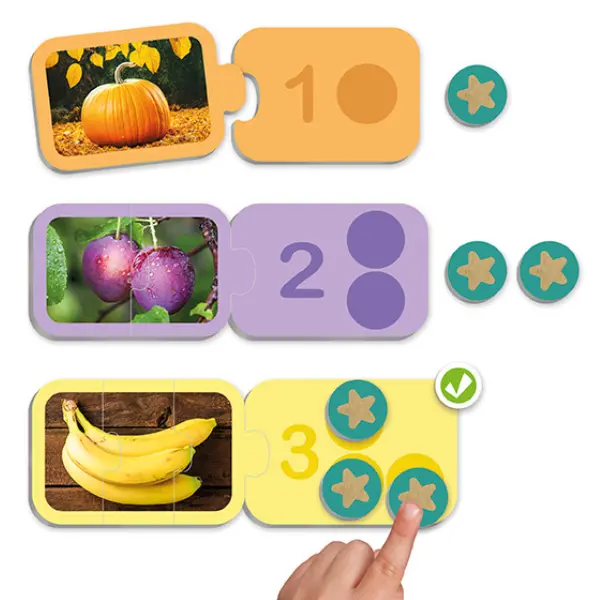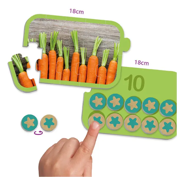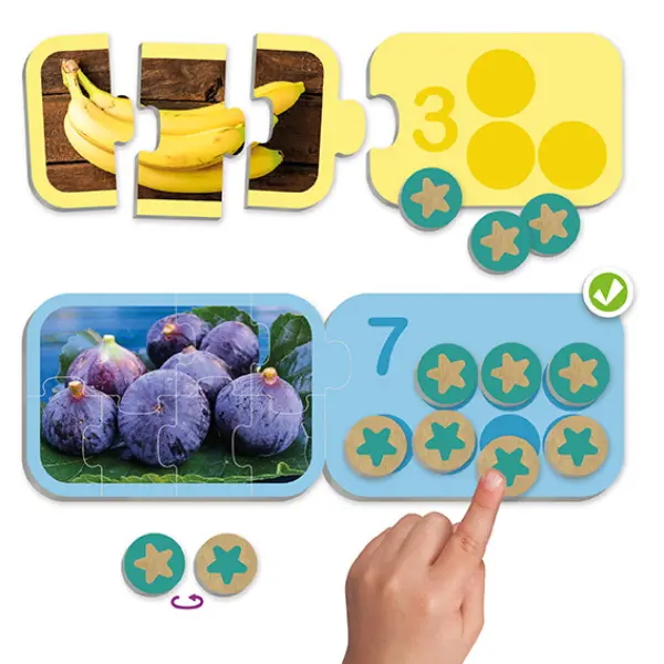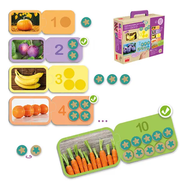 Faça os 10 puzzles, conte os elementos das figuras e complete os tabuleiros com as fichas redondas até o número indicado. E veja como é fácil decompor números de forma visual e intuitiva.