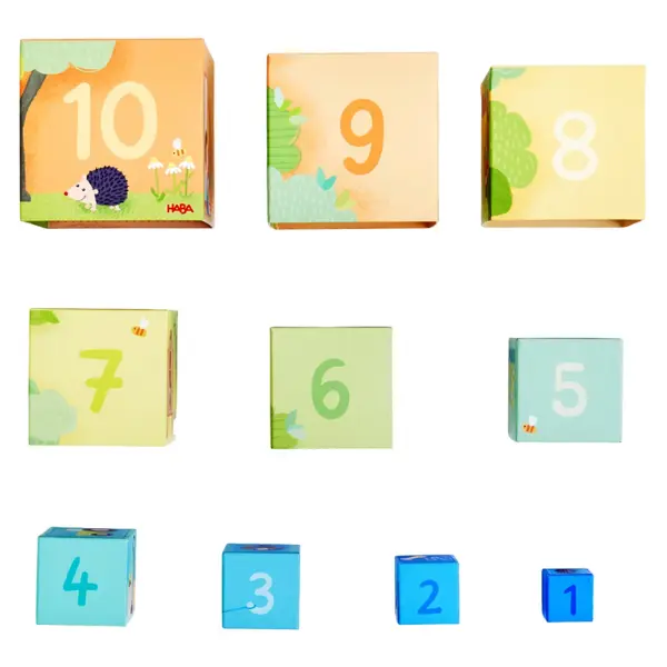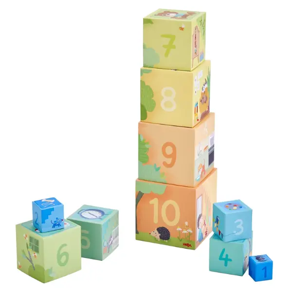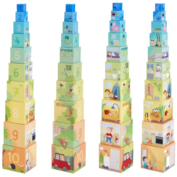 Idade: +1 ano | Conteúdo: 10 cubos de tamanhos diferentes para empilhar | Material: Cartão | Dimensões: 13,2 x 13,3 x 13,3 cm.