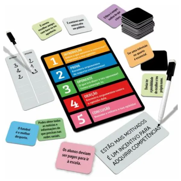 Idade: dos 10 aos 99 anos | Conteúdo: 42 cartões de moção; 1 cartão de estrutura discursiva; 2 quadros brancos; 1 quadro de pontuação; 2 marcadores apagáveis; Regras | Nº jogadores: 3 a 8 | Duração: 20 min | Dimensões: 15,4 x 4,8 x 15,4 cm.