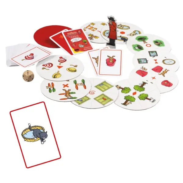 Idade: +5 anos | Conteúdo: 40 cartas com imagens de cada noção; 10 discos com 4 imagens cada; 1 dado em branco; Conjunto de etiquetas adesivas para colocar no dado; Personagem do jogo – peão “Ladrão”, e respetivo suporte; Instruções.