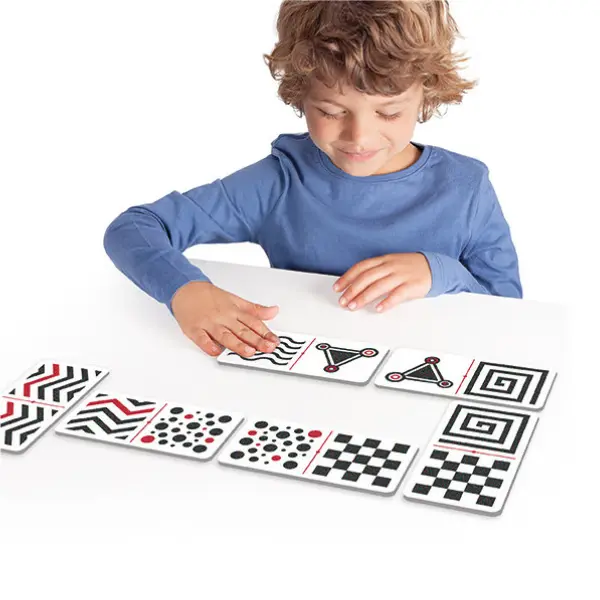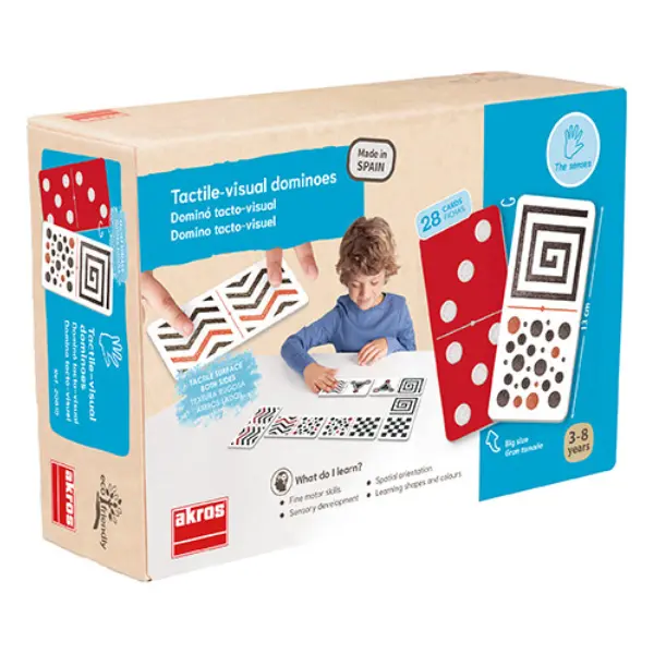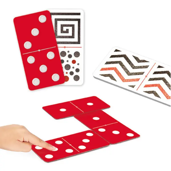 Dominó tátil de grande formato, com textura áspera e ilustrações de alto contraste. Desenvolve a discriminação visual e táctil.