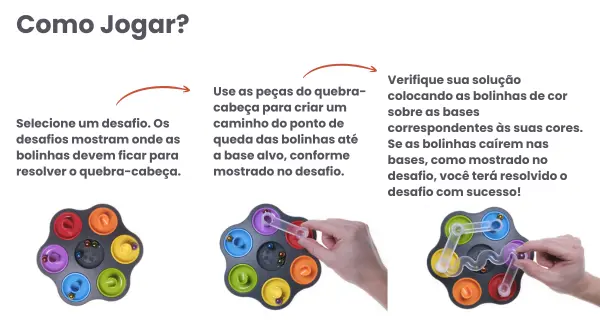 Conteúdo: 1 tabuleiro de jogo com seis bases, 6 bolinhas, 2 espaçadores, 5 rampas curtas, 2 rampas longas, 1 livreto de desafios.