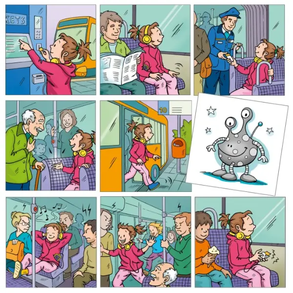 Os dois extraterrestres nas cartas adicionais podem ser usados como seres que não conhecem as regras do “nosso mundo” e, portanto, se comportam de maneira errada. As crianças podem usar esses cartões para atribuir o comportamento socialmente indesejável a um alienígena da sua escolha e explicar o que ele está a fazer de forma incorreta. Então a criança pode identificar-se com as pessoas que têm um comportamento ajustado à situação.
