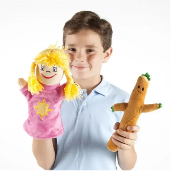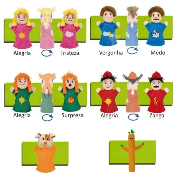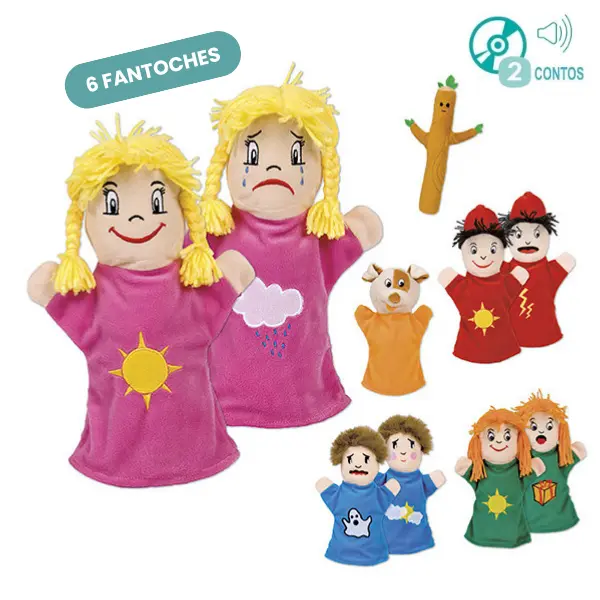 Conjunto de 6 fantoches (4 deles reversíveis com duas caras diferentes), e Ficheiro ÁUDIO Mp3 com a gravação de 2 contos completos com música e diálogos.