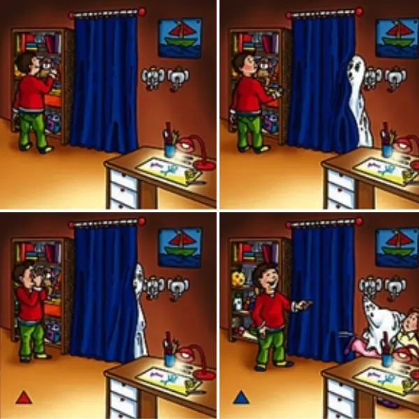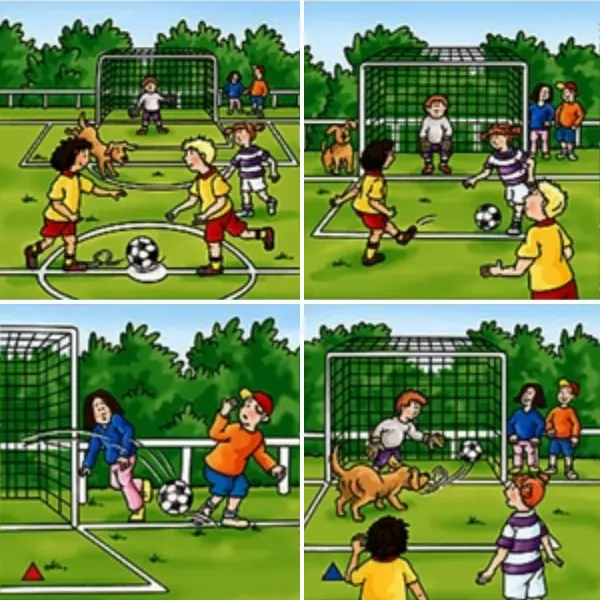 Cada história é contada a partir de quatro imagens e de uma frase-alvo que ilustra uma preposição específica. A história começa com as duas primeiras imagens, que oferecem dois possíveis desfechos, independentes um do outro. O desafio passa pela identificação das noções espaciais e da sua correta expressão verbal enquanto contam a história.