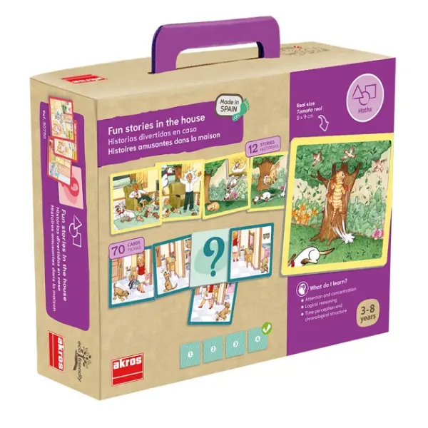 ‘Histórias Divertidas em Casa’ são 12 histórias divertidas que narram situações divertidas que ocorrem no contexto de uma casa. Contém cartões de interrogação para substituir algumas cenas ou colocar no final da história, dando a oportunidade à criança de imaginar o desenlace da mesma.