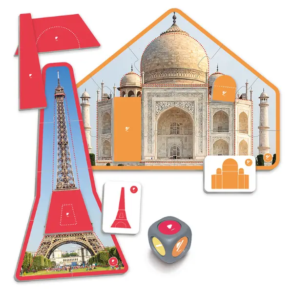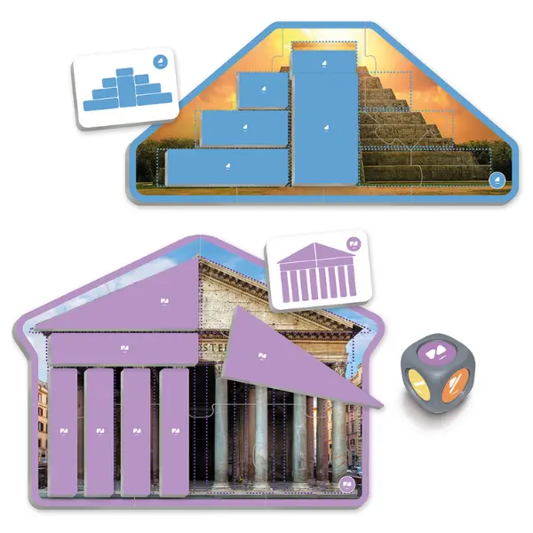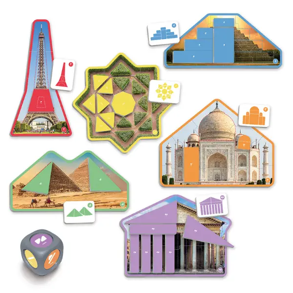 Conteúdo: 6 puzzles com imagens reais; 6 cartões modelo; 52 cartões com formas geométricas e 1 maxi-dado com seis cores (3,5 cm).