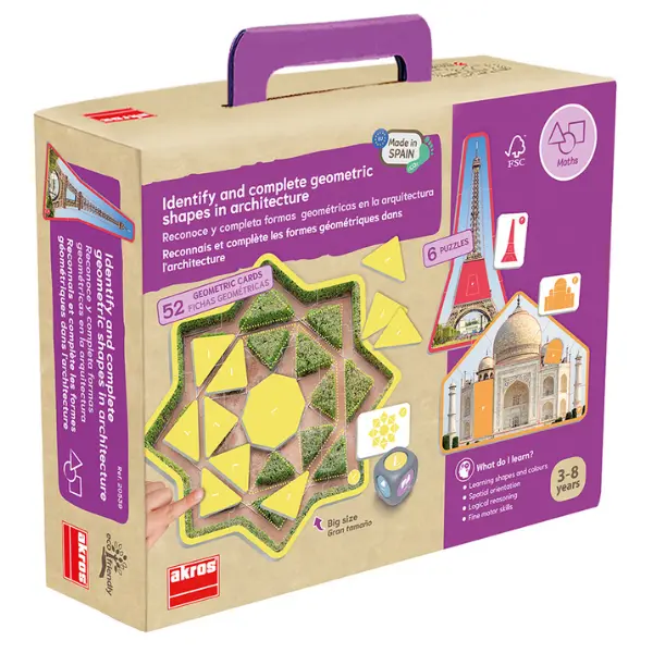Jogo de atenção e observação, que permite às crianças descobrir e completar imagens reais dos 6 puzzles com diferentes formas geométricas.