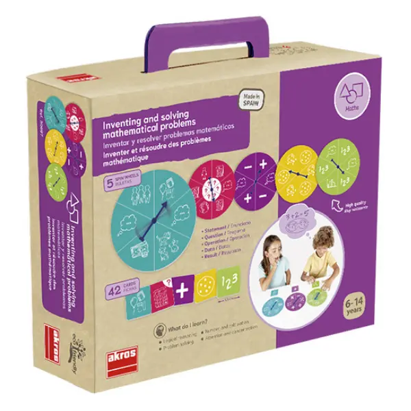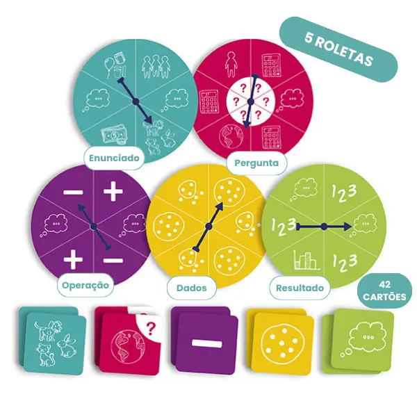Desenvolvido por José António Fernández Bravo. Especialista em Neurodidática para Educação Matemática. Colaborador do Departamento de Educação de Infância e Inclusiva da UNESCO | Conteúdo: 5 roletas (18 cm de diâmetro), 42 cartões (5,5 x 5,5 cm), Guia Didático | Dimensões: 24 x 19 x 7 cm.
