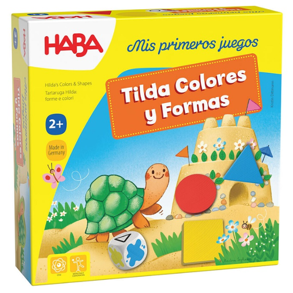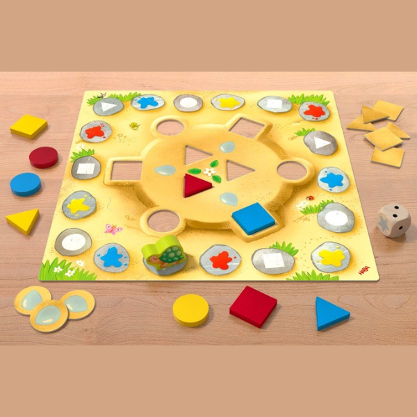Conteúdo: 1 tabuleiro impresso frente e verso, 1 tartaruga de madeira, 1 dado com pintas, 1 dado com cores e formas, 9 peças geométricas de madeira, instruções do jogo.