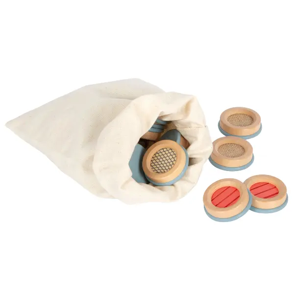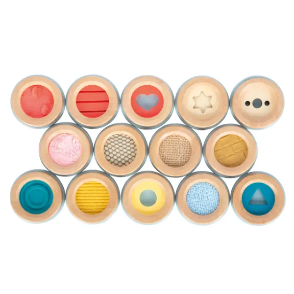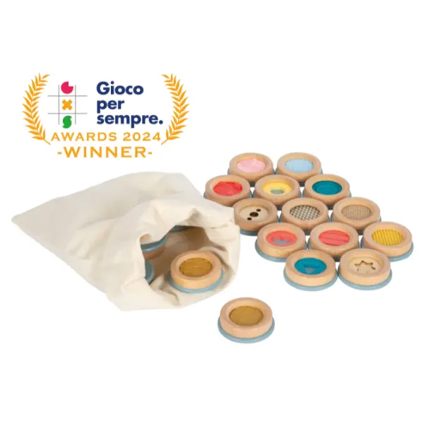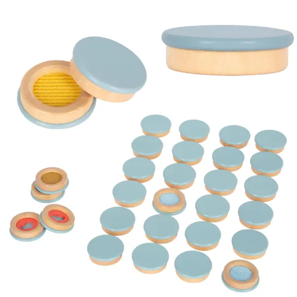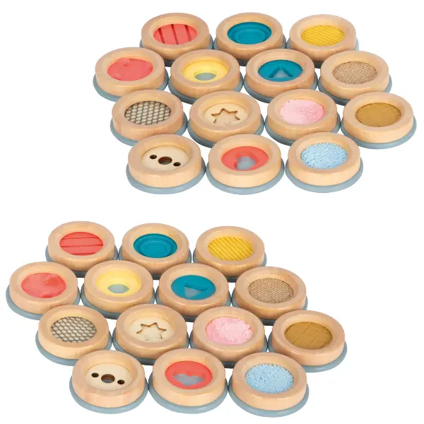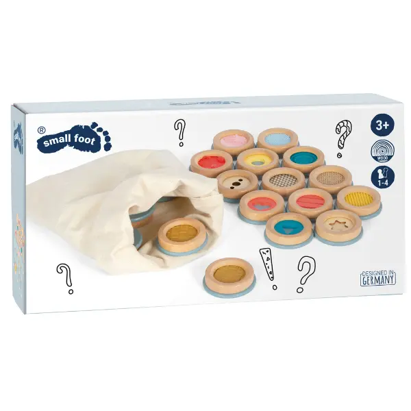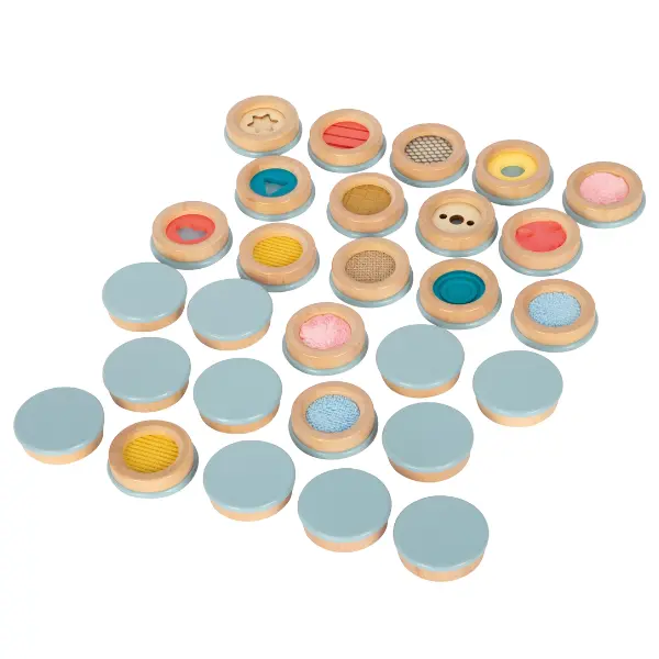 Com este jogo de memória tátil , o objetivo é tocar em várias superfícies e encontrar os pares correspondentes. O jogo tem 28 peças, com 14 superfícies diferentes para tocar, identificar e classificar.