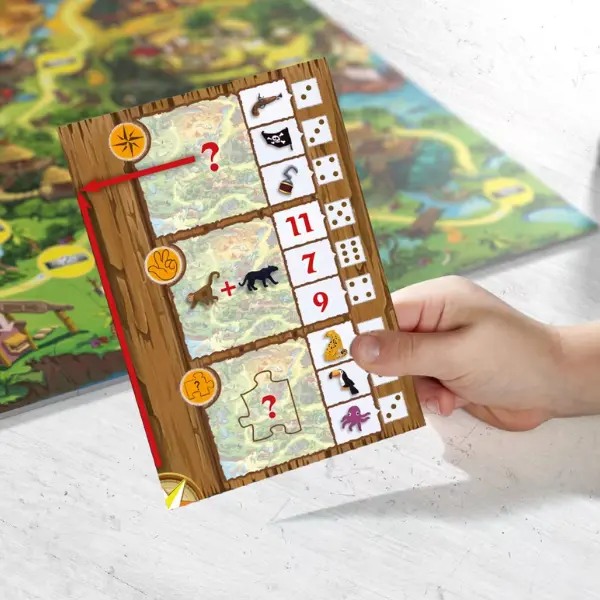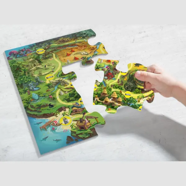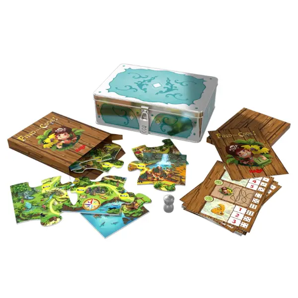 Idade: dos 5 aos 10 anos | Nº de Jogadores: 1 a 6 | Tempo de jogo: 20 min | Conteúdo: 1 cofre do tesouro, 1 cadeado com código, 1 caixa com enigmas, 1 arquivador, 9 peças puzzle (mapa do tesouro), 1 figura de madeira | Dimensões: 24 x 17 x 7,5 cm.