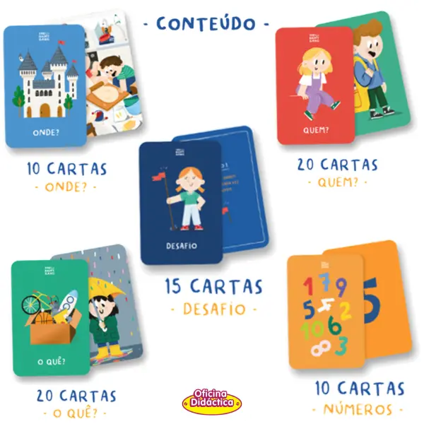 Contém: 10 Cartas “Onde”; 20 Cartas “Quem”; 20 Cartas “O Quê”; 15 Cartas “Desafio”; 10 Cartas “Números” e Livro de Instruções.