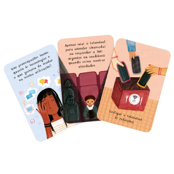 Esta caixa, com 1 livro e 35 cartas, irá ajudar-te a repensar o uso dos ecrãs, conversar sobre os limites, exageros e reconstruir novas