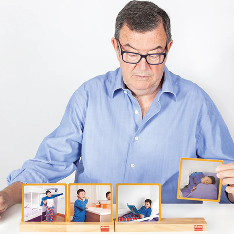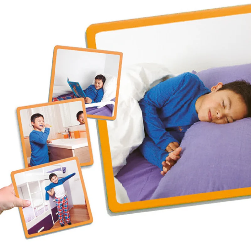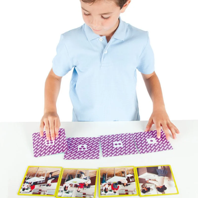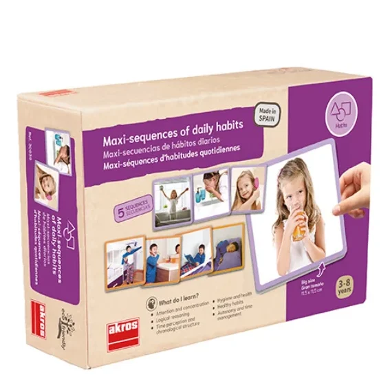 Um conjunto de cinco sequências muito simples, com quatro passos cada, com fotos em grande formato que permitem às crianças aprenderem os hábitos básicos diários de higiene, independência e colaboração nas tarefas domésticas.