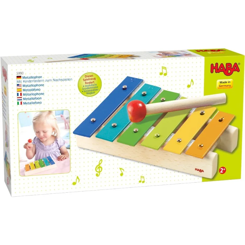 Um metalofone em madeira de faia e metal, com baqueta. As teclas coloridas ajudam a relacionar os tons com as melodias do livro que acompanha o metalofone!