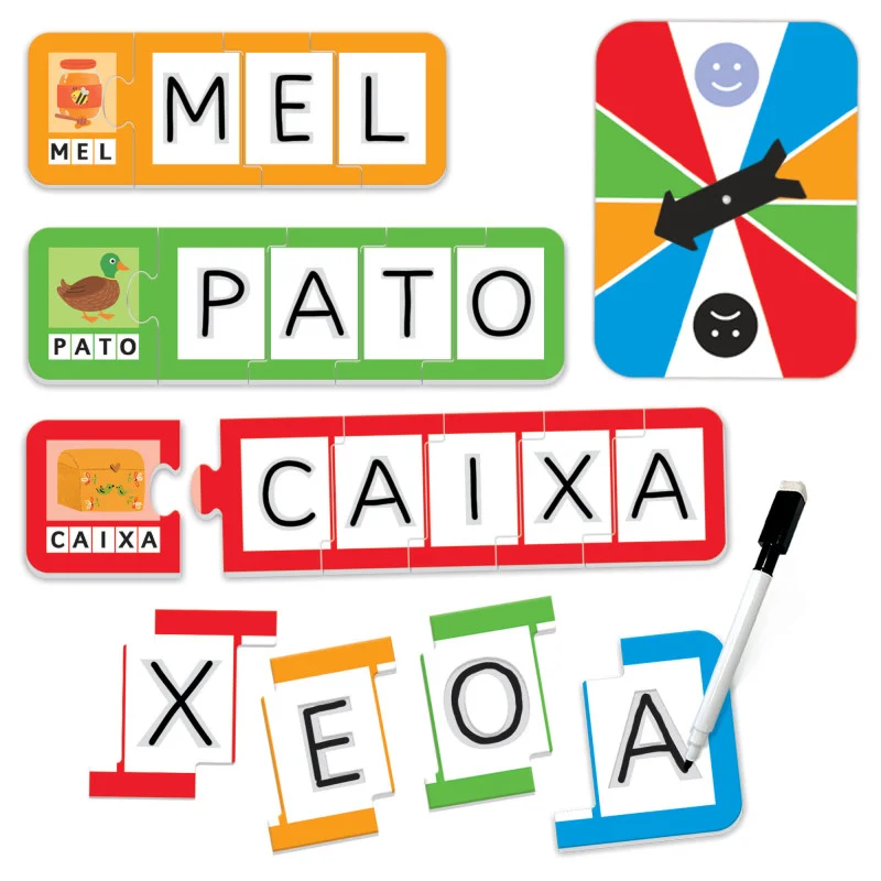 Conteúdo: 16 Peças com imagens, 64 peças-letra autocorretivas, Spinner, Marcador apagável e instruções.
