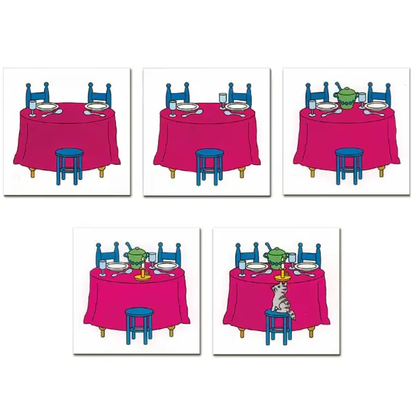 Contém sequências de imagens muito simples. Dentro de cada série, um novo elemento foi adicionado, relativamente ao cartão anterior. As sequências de imagens são recomendadas para trabalhar com crianças em idade pré-escolar, nas várias áreas da Educação Especial e Terapias.