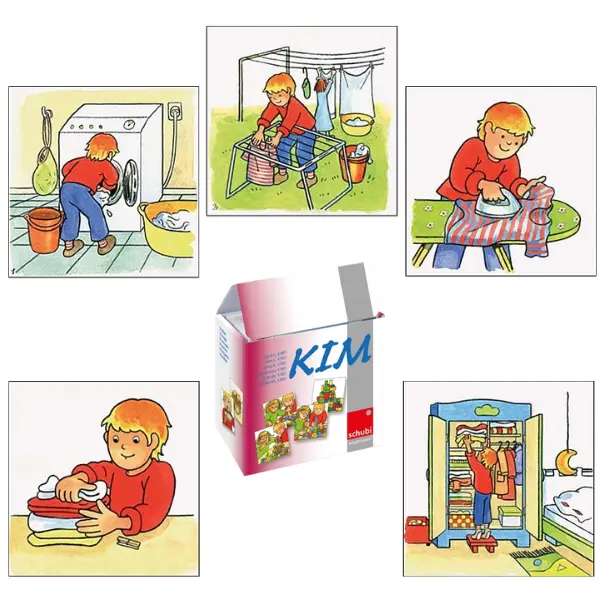 As sequências de imagens “Obrigado, Kim!” ilustram situações de tarefas domésticas ou recados, etapa a etapa. Todas as crianças conhecem as situações representadas e, com a sua experiência, são capazes de ordenar as imagens na sequência correta.