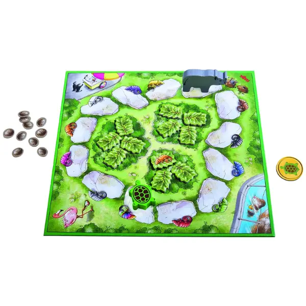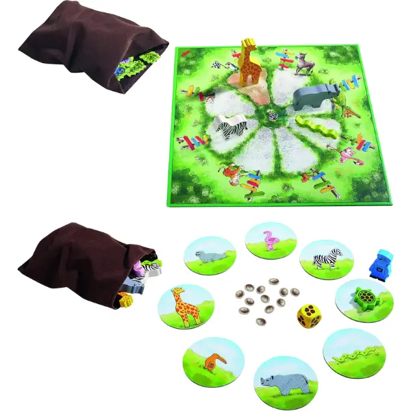 Conteúdo: 1 rinoceronte, 1 zebra, 1 flamingo, 1 foca, 1 girafa, 1 tucano, 1 cobra, 1 tartaruga, 1 tratador de animais Tim, 2 dados de girafa, 1 saco de pano, instruções do jogo