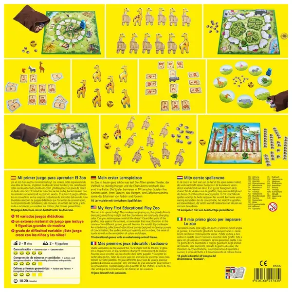 Contém 10 divertidos jogos educativos sobre animais do zoológico, grandes figuras de madeira, com diferentes graus de dificuldade.