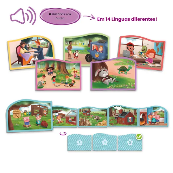 O ÁUDIO MP3 (ONLINE) contém a narração de 6 contos tradicionais em vários idiomas: Os Três Porquinhos ∗ Polegarzinho ∗ A Tartaruga e a Lebre ∗ O Gato das Botas ∗ A Gata Borralheira ∗ Pinóquio.