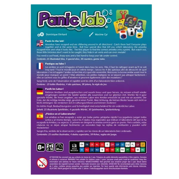 Panic Lab é um jogo onde se pede aos jogadores, para fazerem o papel de cientistas, para afastarem do laboratório as amibas que vão aparecendo. Nesta aventura onde podem jogar até 10 pessoas, os enganos são muitos. É preciso identificar corretamente a amiba através da sua cor, forma e padrão que é previamente definida com um lançamento de dados. Contudo a tarefa no início é bastante simples, cabendo ao jogador mais rápido amealhar moedas de vitória. Mas as facilidades vão-se transformando em dificuldades e as amibas vão-se adaptando e podem mudar de cor ou fugir pelo sistema de ventilação. Claro está que, com todas estas mudanças, a confusão vai ser muita e vai haver muitas gargalhadas e interação entre os jogadores que às duas por três já não sabem onde está a amiba.