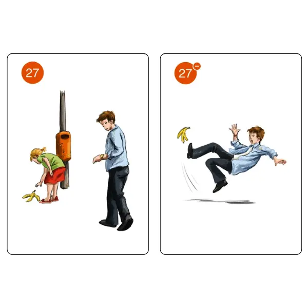 São 60 cartas divididas em 30 pares, cada um dos quais formam um final com uma oração principal e uma subordinada. Os 30 pares de cartas estão divididos em dois grupos: 15 pares com frases afirmativas e 15 pares com uma oração subordinada negativa. As cartas estão numeradas no canto superior esquerdo. As que formam um par têm o mesmo número. As cartas com sinal positivo são para desenvolver frases afirmativas; as que têm o sinal negativo, para as frases negativas.