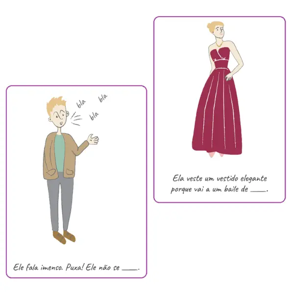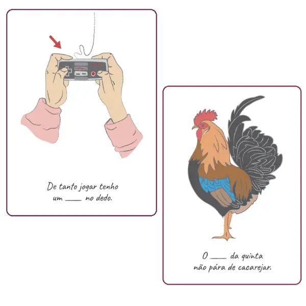 Este material de intervenção terapêutica foi primordialmente pensado para terapeutas da fala, contudo pode ser utilizado por outros profissionais, é constituído por 48 cartões estímulo que são pares mínimos e dois cartões onomatopaicos: um pretende apresentar o som “k”, este é patente no desenho de um rapaz a tossir, surge o som ‘cah cah‘ e outro para “g” representado num desenho de um peru, surge o som ‘glu glu‘.
