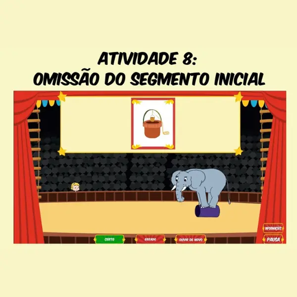 Atividade 8: Omissão de segmento inicial – O elefante Dimbi ajuda na promoção da omissão do segmento inicial. Para ver o vídeo clique aqui.