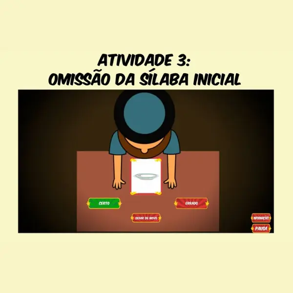 Atividade 3: Omissão da sílaba inicial – O mágico Rony ajuda na promoção da capacidade de omitir a sílaba inicial da palavra e descobrir a nova palavra. Para ver o vídeo clique aqui.