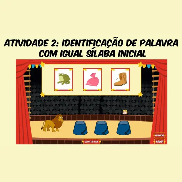 Atividade 2: Identificação de palavra com igual sílaba inicial – O leão Leoni ajuda ajuda na promoção da capacidade de isolar a primeira sílaba e identificar quais as palavras que iniciam com a mesma sílaba. Para ver o vídeo clique aqui.