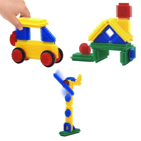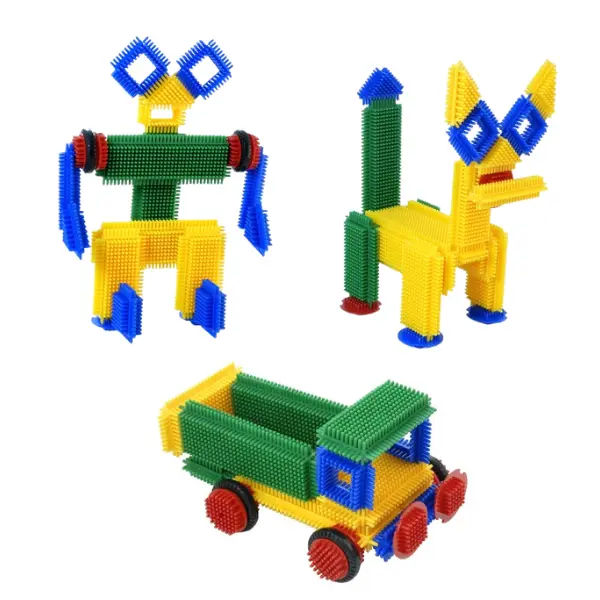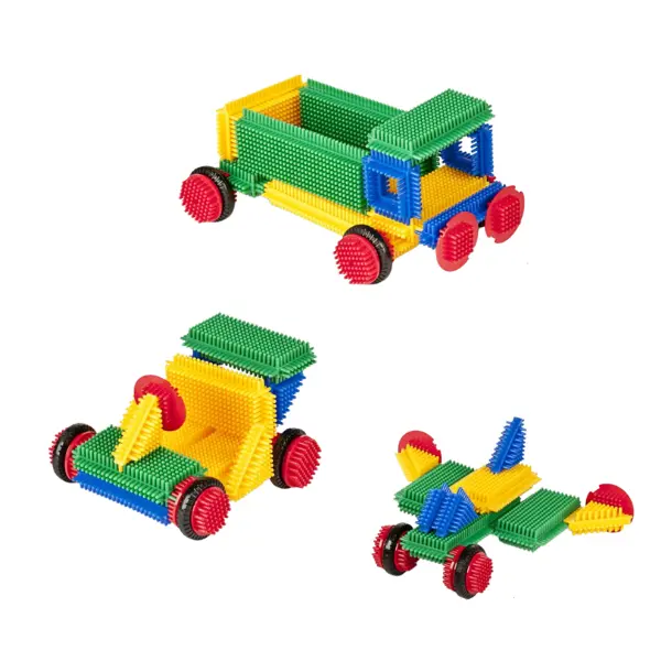 Com as peças encaixáveis entre si, para construir casas, bonecos ou até carros. Os carros podem deslocar-se, pois também há peças com rodas…