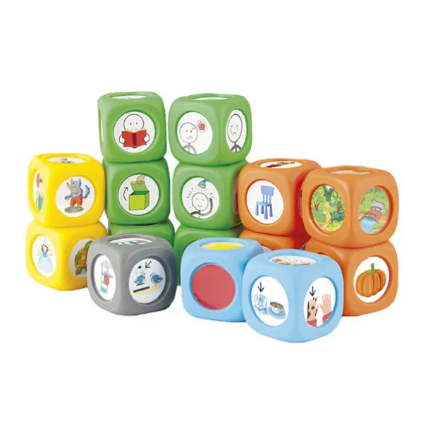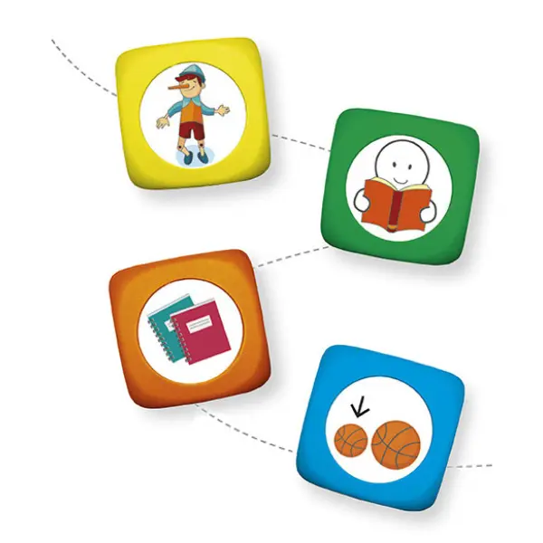 Objetivos: Aprender a formar frases com a ajuda de dados com pictogramas; – Ampliar o vocabulário por campos semânticos. Cada dado desenvolve um tema específico (consulte o ANEXO I); Identificar absurdos (quando, ao lançar os dados, a frase obtida não faz sentido: Ex.: O Pinóquio penteia a bola); Ajudar a desenvolver a atenção e a memória; Motivar a comunicação; Facilitar o início da compreensão da leitura.